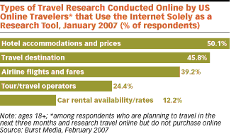 In a study completed by Burst Media in February 2007, they surveyed the types of travel research conducted online by US travelers that use the internet solely as a research tool. They found that 50.1% of those polled searched for hotel accommodations and prices on the internet . These types of statistics remind us that regardless of how we measure the impact of the internet, the reality is that the channel is hugely important. With this increasing shift in “lookers” to the internet, it’s imperative for hoteliers to position themselves advantageously on this popular channel.